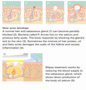 The Ellipse treatment for acne works by reducing the blood supply to sebaceous gland, which slows down production of the body oil sebum.